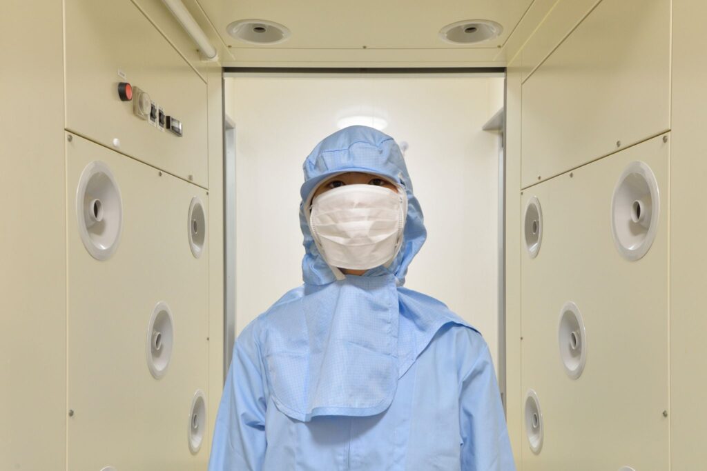工場に入るときは、帽子、マスク、専用の作業着に着替えるのはもちろん、粘着ローラーで全身の埃をとり、エアシャワーで目に見えない塵を吹き飛ばします。30秒を2回、タイマーで計って行う丁寧な手洗いと消毒を終えて、ようやく私たちは食材の前に立つことを許されます。