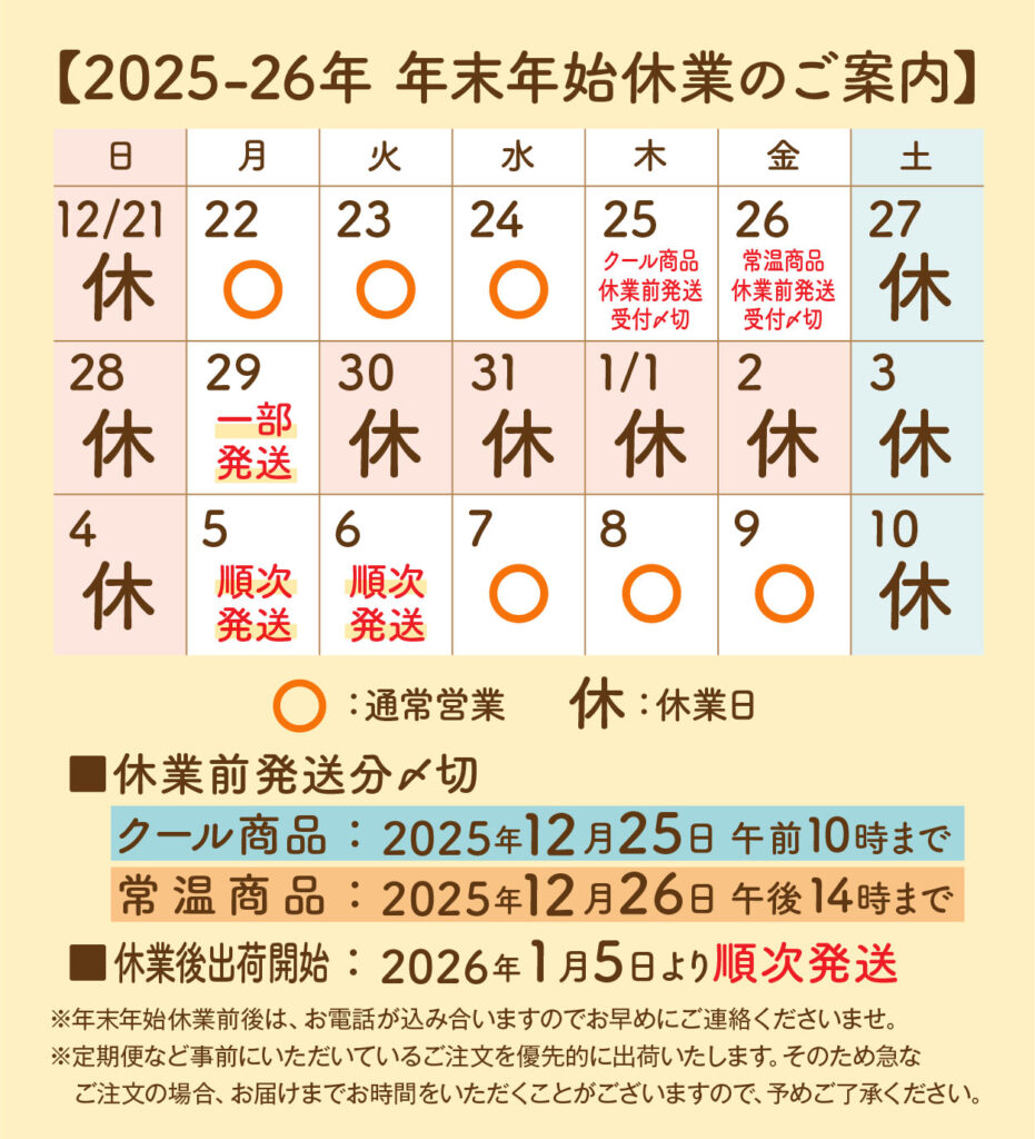 また、前倒ししての発送がご不安な場合は、お届け予定日より早めのお受け取り、もしくは年明けの1月7日発送をおすすめいたします。