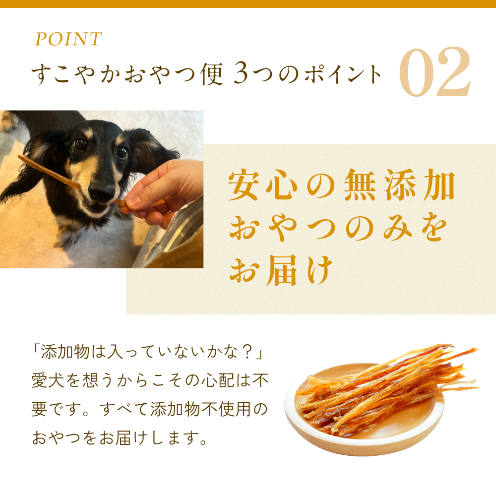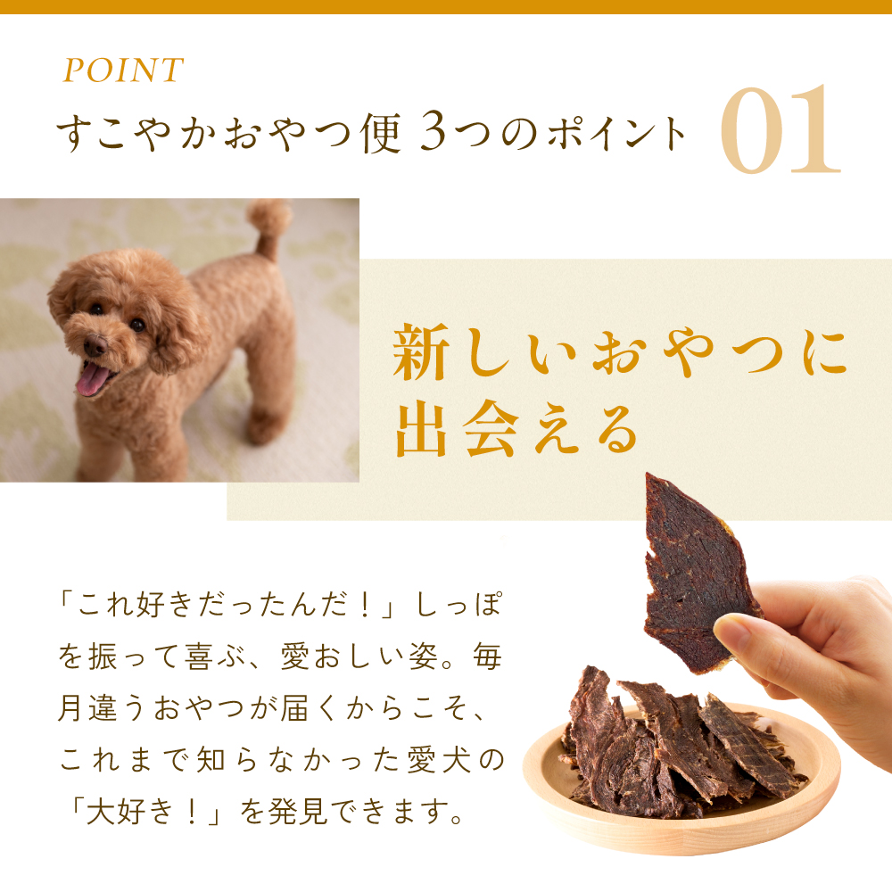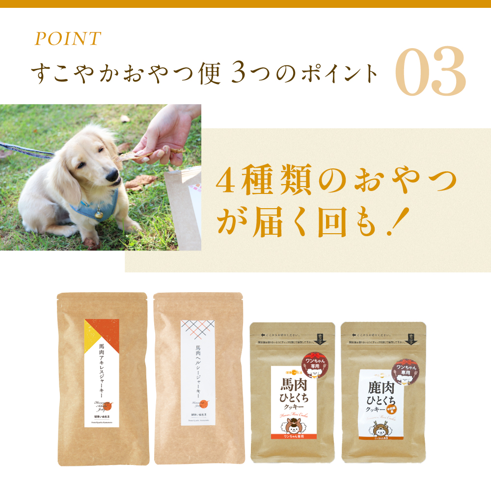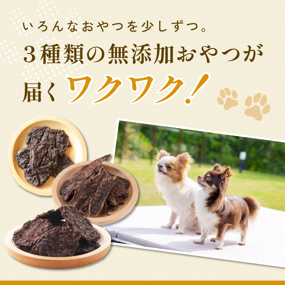 健康いぬ生活こだわりの馬肉をメインに、鹿肉、牛肉、鶏肉など高品質なおやつを一度の定期便で3種類厳選してお届けします。入っているおやつは、箱を開けてからのお楽しみ!自分では選ばないおやつとの新しい出会いが、愛犬の隠れた好みを見つけるきっかけに。「うちの子、これが好きなんだ!」そんな愛犬の新しい一面を発見できるかもしれません。愛犬との絆を深めるおやつ時間をお楽しみください。