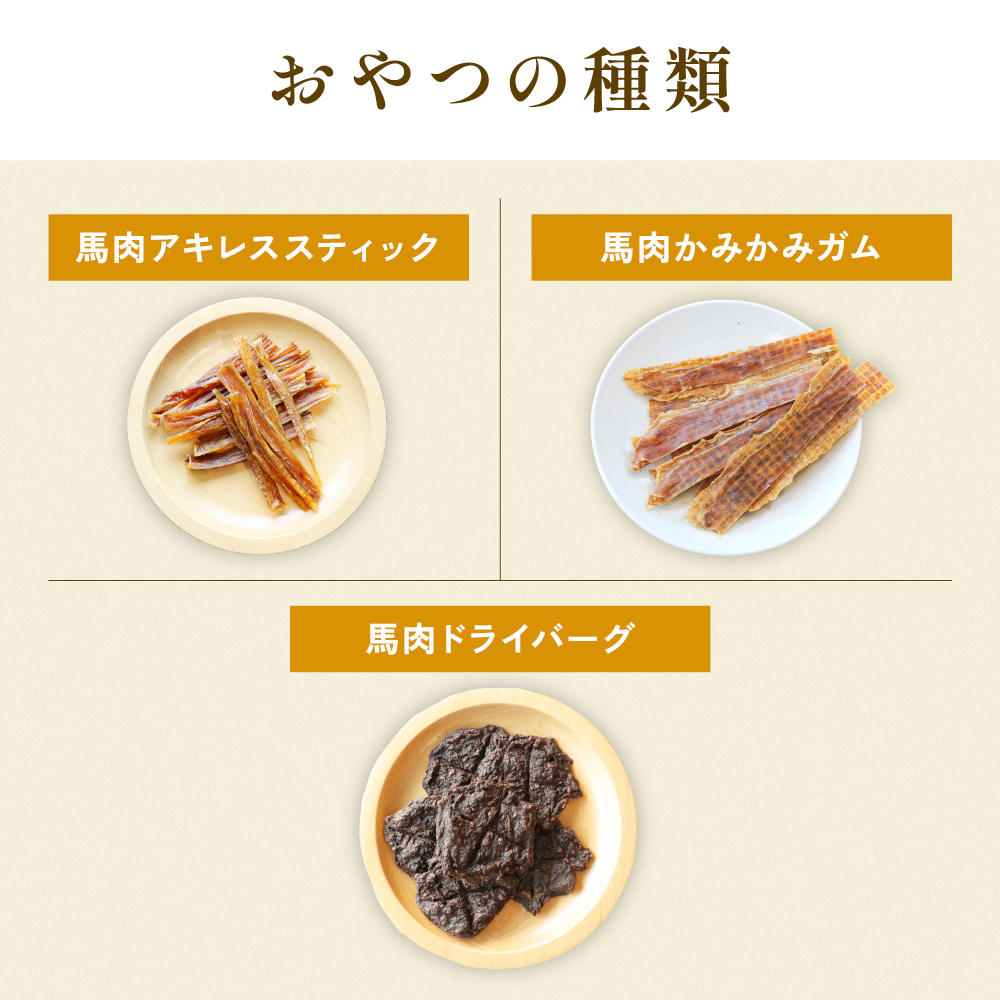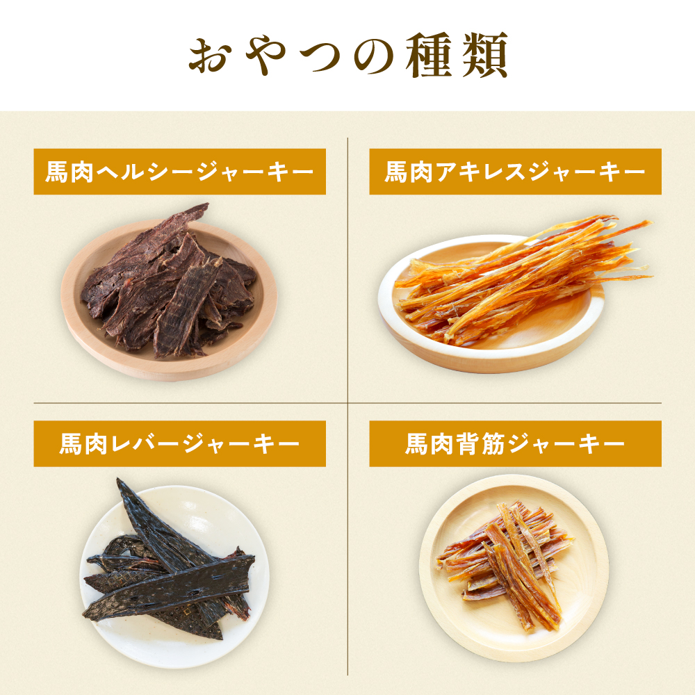 馬肉ヘルシージャーキー, 馬肉アキレスジャーキー, 馬肉レバージャーキー, 馬肉背筋ジャーキー, 馬肉アキレススティック, 馬肉かみかみガム, 馬肉ドライバーグ, 馬肉ひとくちクッキー