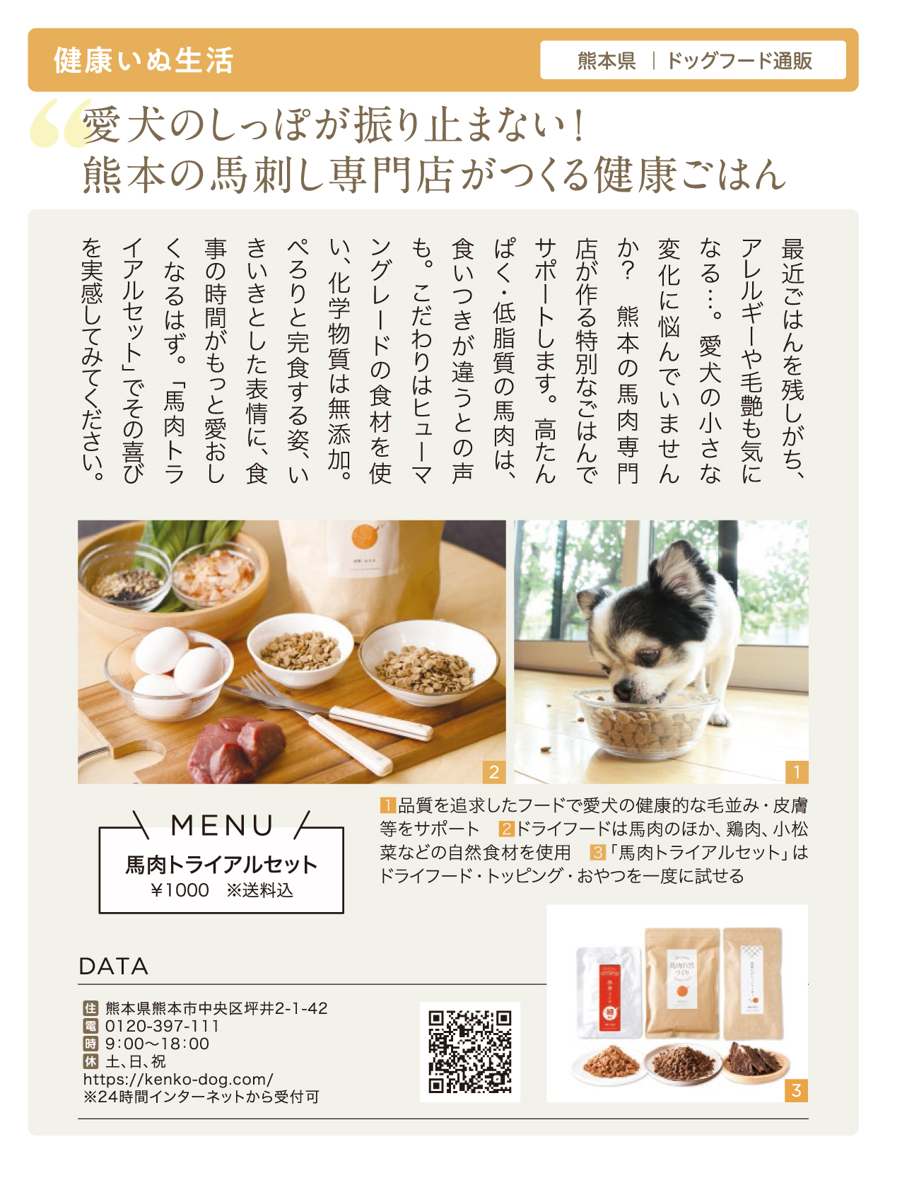 - ・「馬肉トライアルセット」を紹介: 食いつきやアレルギー、毛並みのパサつきに悩む飼い主様の「救い」になるための、こだわりの3点セットです。